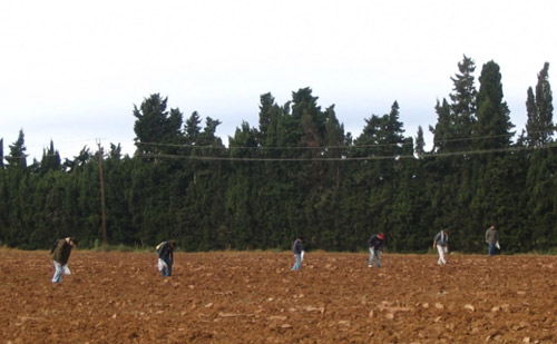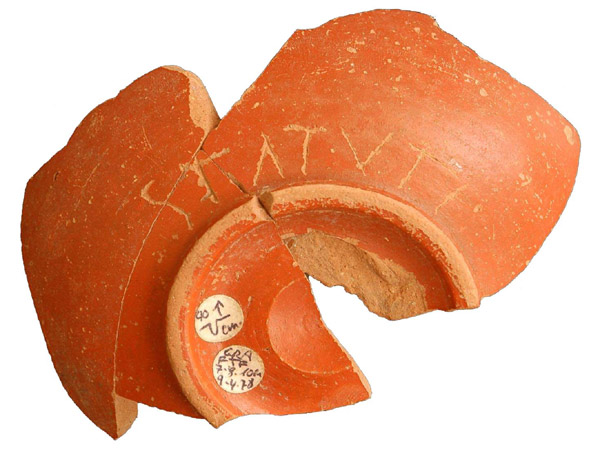 Pedestal honorífic trobat en medi rural i copa de terra sigil·lada amb el grafit STATVTI, que indica la propietat. A la dreta, arqueòlegs prospectant un camp.