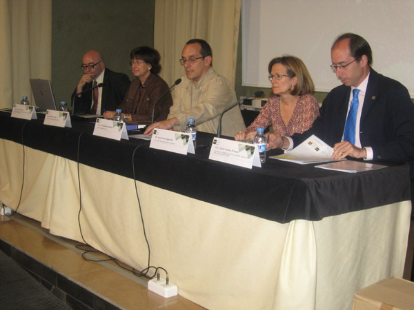 Imatge de la sala on es va presentar el llibre i aspecte de la taula, presidida per Isabel Rodà, directora de l’Institut Català d’Arqueologia Clàssica, i per Luis J. Fernández, director del Centro Asociado de la UNED de Tudela. Als extrems, Javier Cabrero (esquerra) i Javier Andreu (dreta), editors de l’obra juntament amb Isabel Rodà.