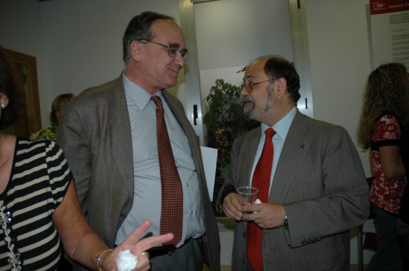 A la imatge de l’esquerra, Josep Guitart, primer director de l’ICAC, i Antoni Gonzàlez, secretari general de la URV i secretari del Consell de direcció de l’ICAC. A la dreta, Jordi Peiret, administrador, conversant amb Isabel Rodà, directora.
