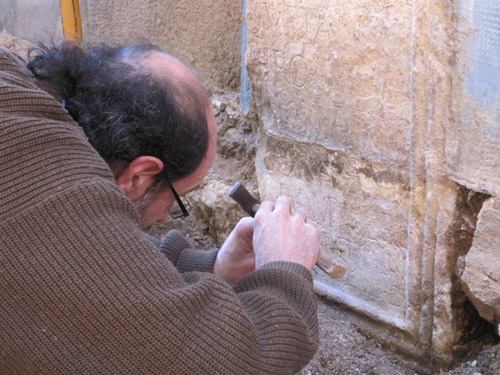Per un avís de l’empresa Némesis, que feia el seguiment de les obres del carrer Mediona. La peça és a la façana d’una casa. Vam ser nosaltres que vam picar el morter de calç que hi havia enganxat al peu del pedestal i que tapava les últimes línies. Va ser una feina pacient de llimadors! Sort que la pluja ho havia estovat!