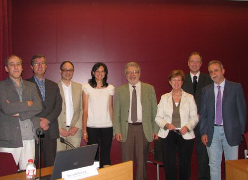 El tribunal estava format per Isabel Rodà (ICAC), Joaquin Ruiz de Arbulo (URV-ICAC), Desiderio Vaquerizo (Universitat de Còrdova), Jacopo Ortalli (Universitat de Ferrara) i John Pearce (King’s College de Londres). A la foto, amb els directors de tesi i la ja doctora Judit Ciurana.