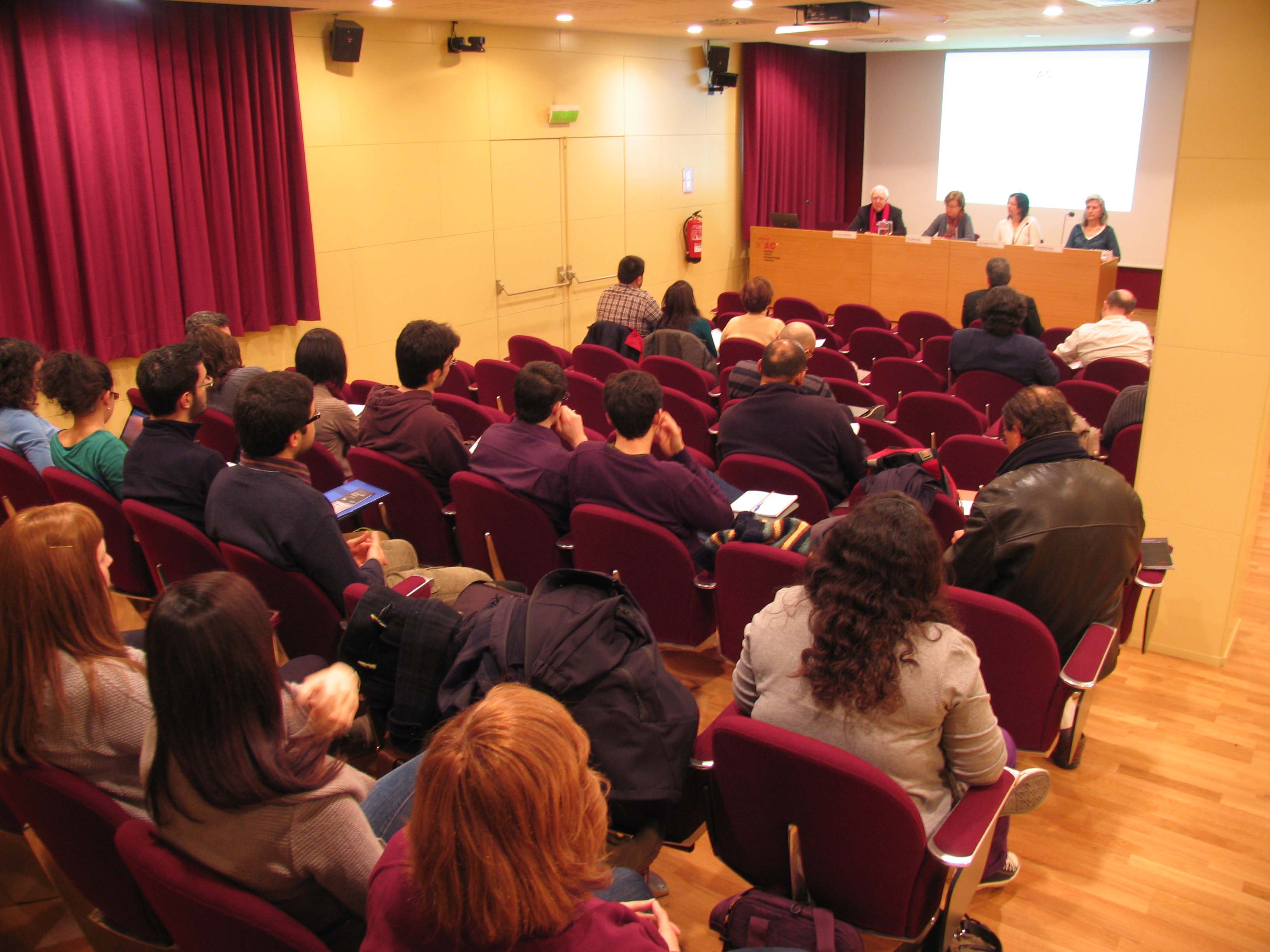 A la foto superior, d’esquerra a dreta, Jaume Sobrequés, president de la Societat Catatana d’Estudis Històrics (Institut d’Estudis Catalans), entitat col·laboradora del seminari; Isabel Rodà, directora de l’ICAC; Annalisa Marzano (Universitat de Reading) i Marta Prevosti (investigadora de l’ICAC). A sota, intervenció de la professora Marzano i imatge de la sala d’actes de l’Institut.