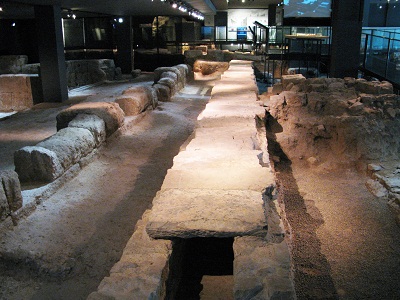 El cardo maximus d’Empúries (esquerra) i la claveguera del decumanus maximus de Valentia, a la zona arqueològica de l’Almoina.