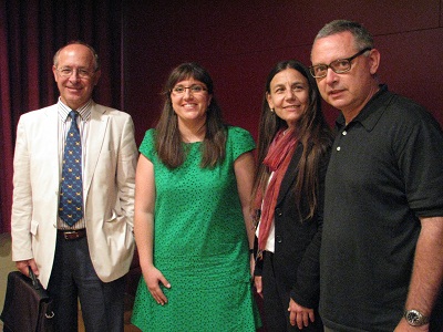 Imatge de Núria Romaní defensant la tesi i d’ella mateixa amb el tribunal, format, d’esquerra a dreta, pels professors Manuel Bendala Galán (Universidad Autónoma de Madrid), Luisa Migliorati (Università degli Studi di Roma “La Sapienza”), i Joaquim Pera Isern (Universitat Autònoma de Barcelona).