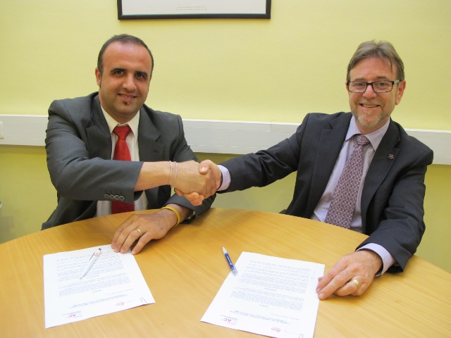 Signatura del conveni a la seu de l’ICAC. A l’esquerra, Alberto Gómez, de Leica Geosystems, i a la dreta, Josep Manel Ricart, vicerector de Política Acadèmica i Científica de la Universitat Rovira i Virgili, en representació de l’ICAC.