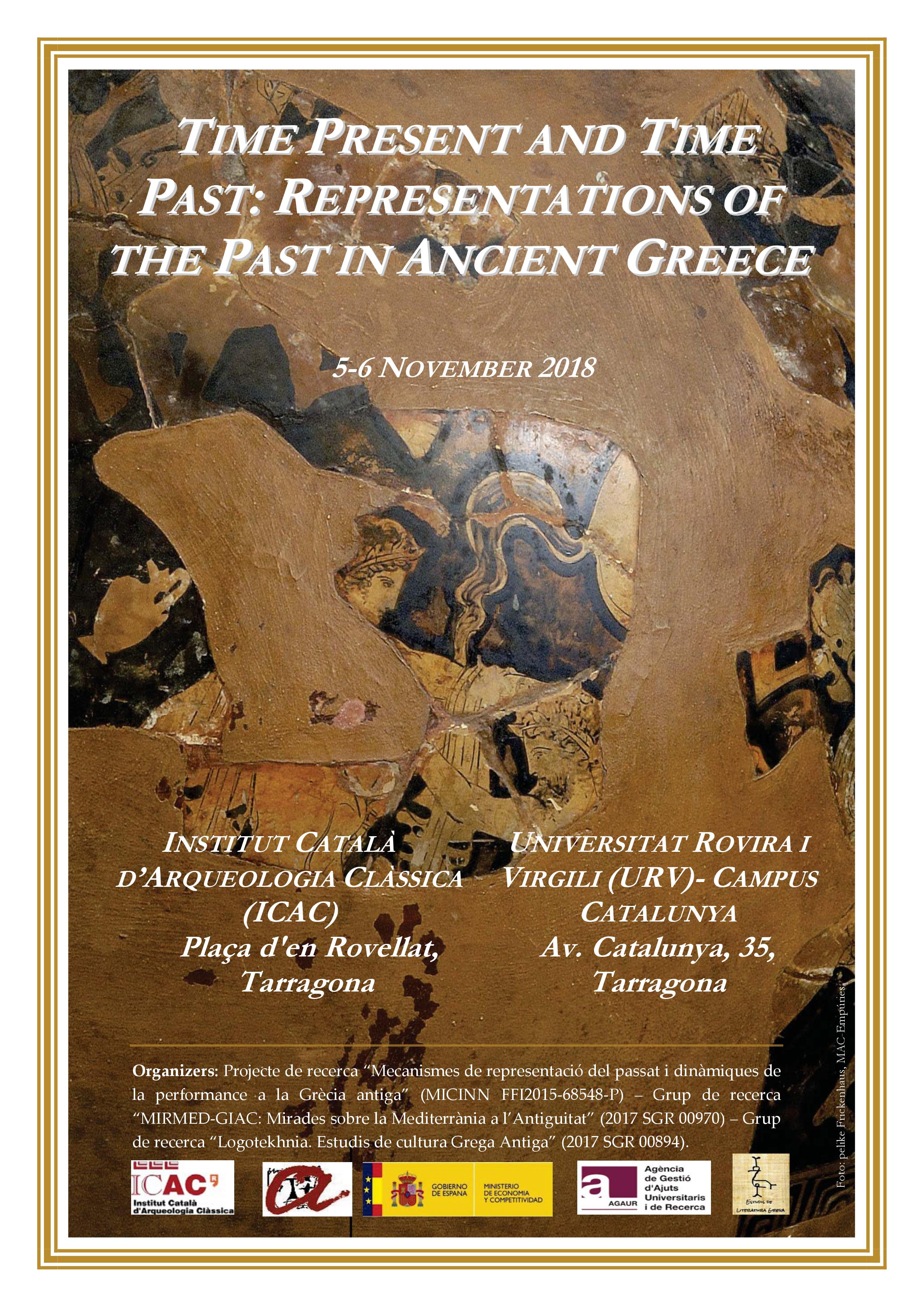 Els propers 5 i 6 de novembre tindrà lloc a Tarragona el col·loqui “Time Present and Time Past: Representations of the Past in Ancient Greece”. És una activitat organitzada per l’ICAC i la URV, en el marc del projecte de recerca “Mecanismes de representació del passat i dinàmiques de la performance a la Grècia antiga” (MICINN FFI2015-68548-P). Podeu descarregar el programa aquí.