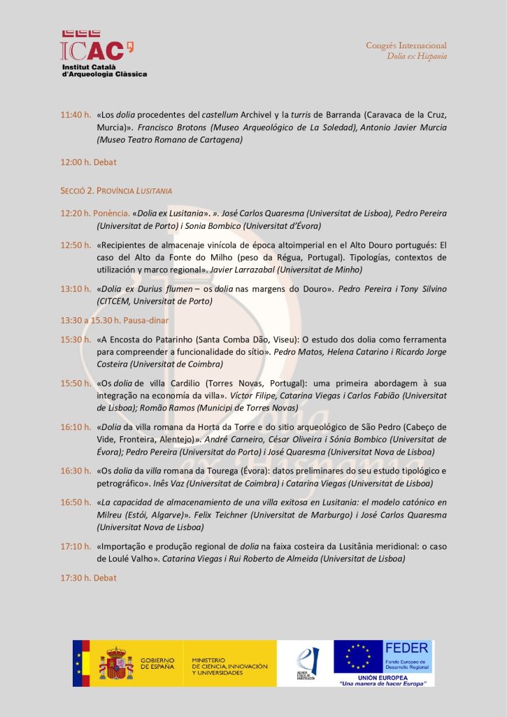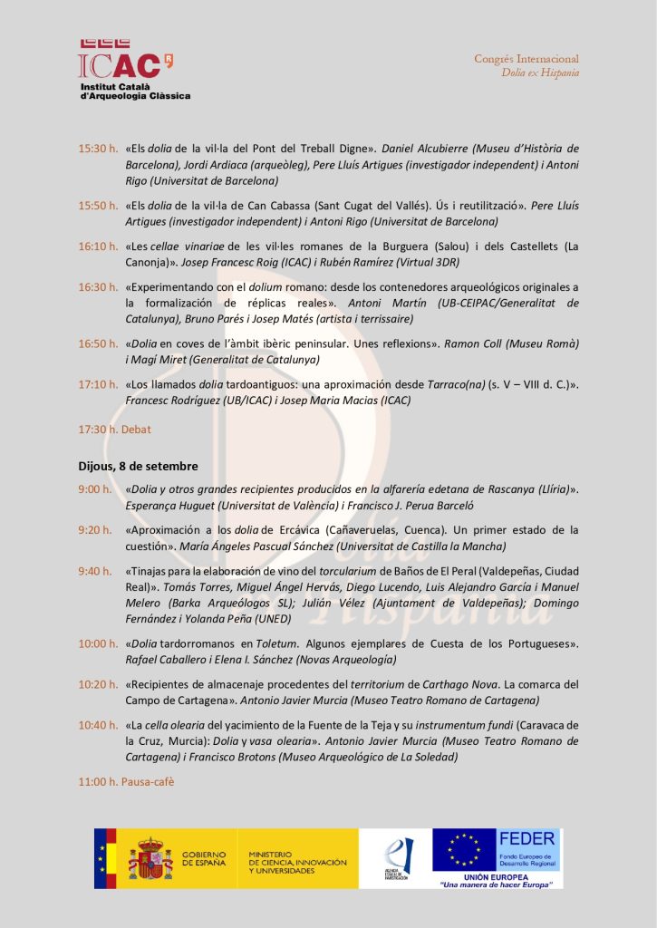 El programa del Congrés Internacional Dolia ex Hispania. Els dolia a les províncies d’Hispània en època romana inclou prop de 40 comunicacions, amb la participació d’un centenar d’investigadors i investigadores de 43 universitats, centres de recerca i entitats d’Espanya, França, Portugal, Alemanya, Itàlia, Romania i Marroc.