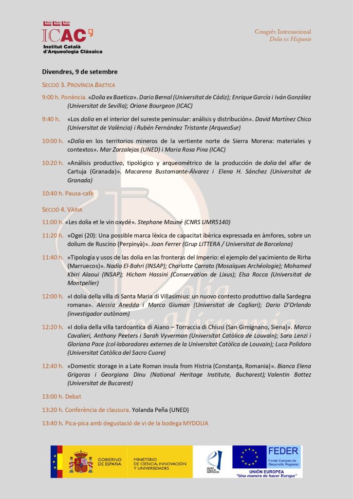 El divendres 9 de setembre serà el torn de la província Betica que, amb quatre comunicacions, començarà a les 9 h amb la ponència «Dolia ex Baetica», a càrrec de Dario Bernal (Universitat de Cádiz), Enrique García i Iván González (Universitat de Sevilla), i Oriane Bourgeon (ICAC).