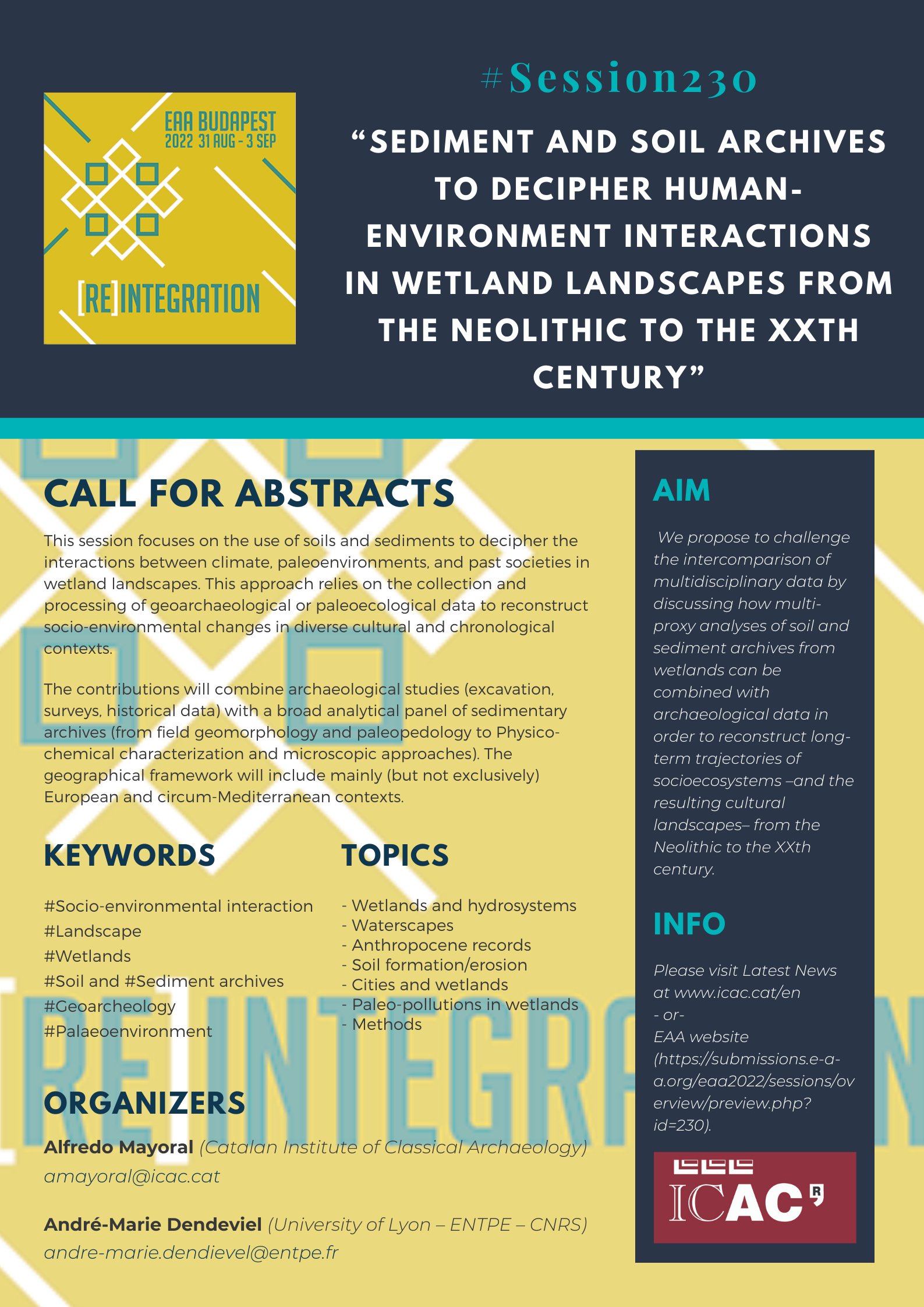 La sessió es titula “Sediment and soil archives to decipher human-environment interactions in wetland landscapes from the Neolithic to the XXth century”, i l’organitzen Alfredo Mayoral (ICAC) i André-Marie Dendeviel (Universitat de Lió – ENTPE – CNRS).