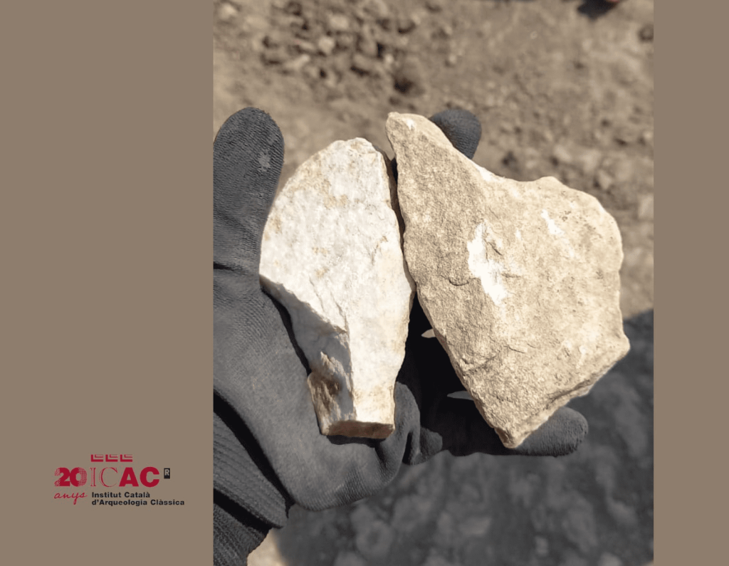 Una confirmació addicional d’aquesta hipòtesi vindria amb el recent descobriment de diverses tesseres de mosaics durant la primera setmana de treball sobre el terreny. Les excavacions en curs han aportat més peces de marbre, també restes d’elements arquitectònics, i productes semi-acabats, en línia amb l’evidència de campanyes anteriors: pedres pertanyents a un mur destruït a la rasa excavada, diverses peces de marbre formades per restes d’obra (estelles) i peces semielaborades.