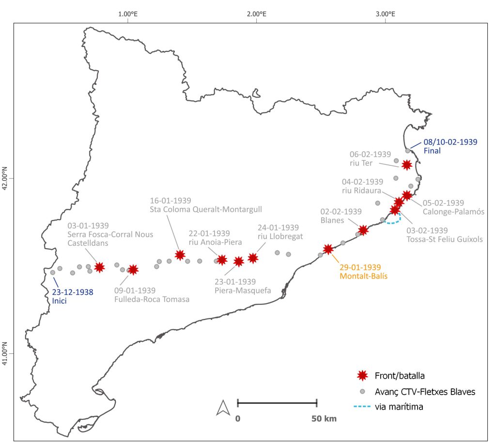 L’ofensiva franquista a Catalunya va començar a finals de desembre de 1938 i es va allargar fins a principis de febrer de 1939. L’Exèrcit Popular, gairebé desfet després de la derrota a la batalla de l’Ebre i el desgast del front al Pallars, va intentar reorganitzar el front en successives línies de defensa i va combatre en episodis de resistència republicana al llarg del territori. Alguns d’aquests enfrontaments han deixat restes materials que s’han excavat i recuperat en els últims anys, com ara la batalla de l’Ordal o les trinxeres d’Abrera al riu Llobregat.