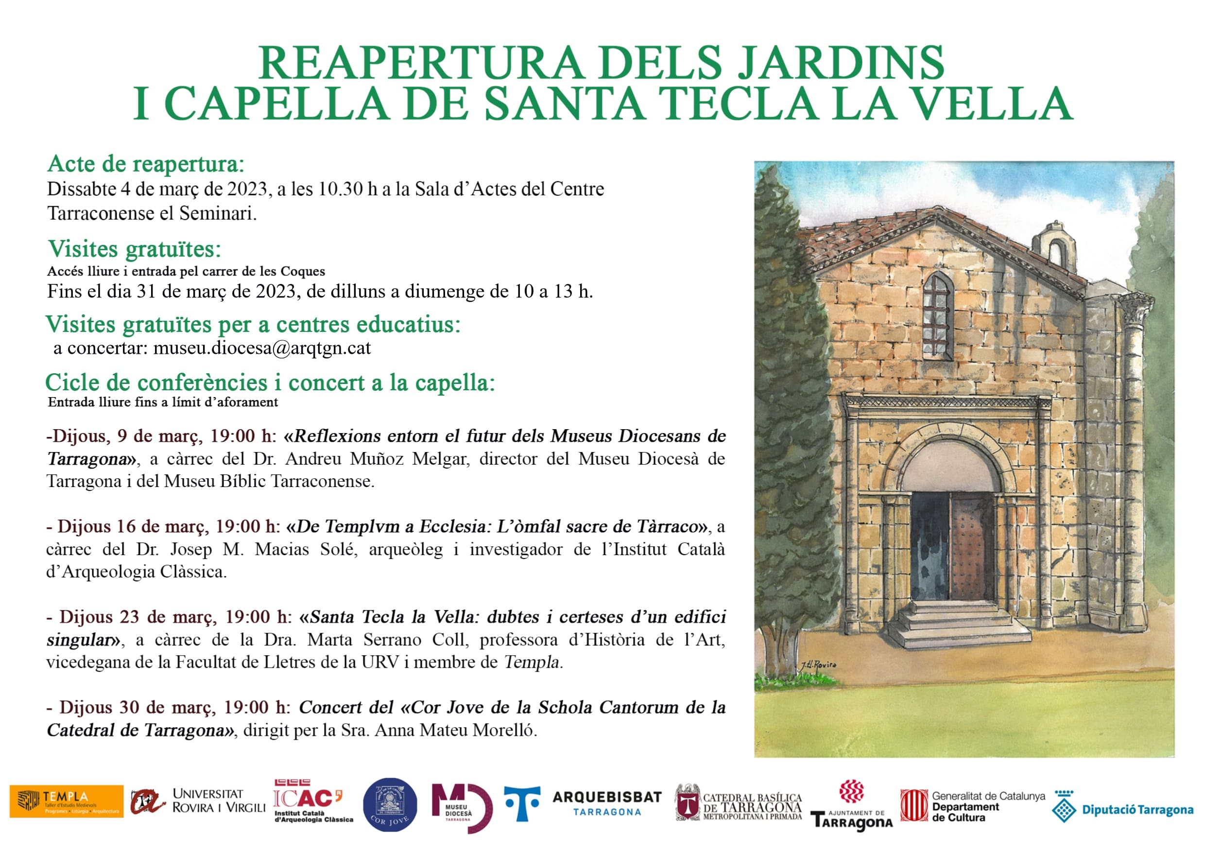 - El dijous dia 23, a les 19.00 h, la Dra. Marta Serrano Coll, professora d’Història de l’Art i vicedegana de la Facultat de Lletres de la URV, oferirà la conferència «Santa Tecla la Vella: dubtes i certeses d’un edifici singular».