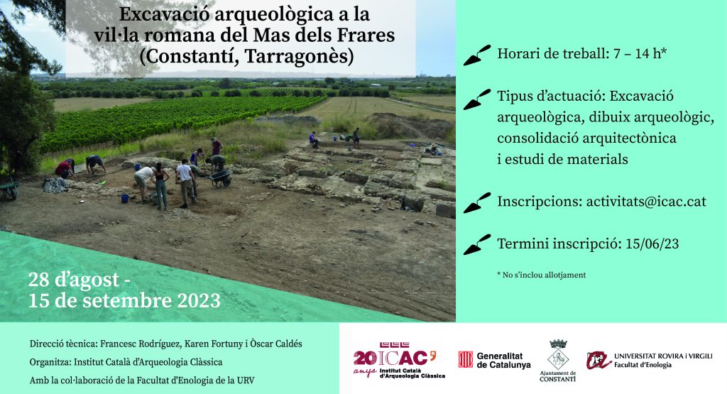 La intervenció està programada per als dies 28 d’agost al 15 de setembre de 2023 i es durà a terme en el marc del projecte de recerca Estudi i difusió de la vil·la romana del Mas dels Frares (Constantí, Tarragonès), II Fase, sota la direcció tècnica de Francesc Rodríguez, investigador postdoctoral adscrit a l’ICAC, i Karen Fortuny i Òscar Caldés, investigadors predoctorals al grup MIRMED de l’ICAC.