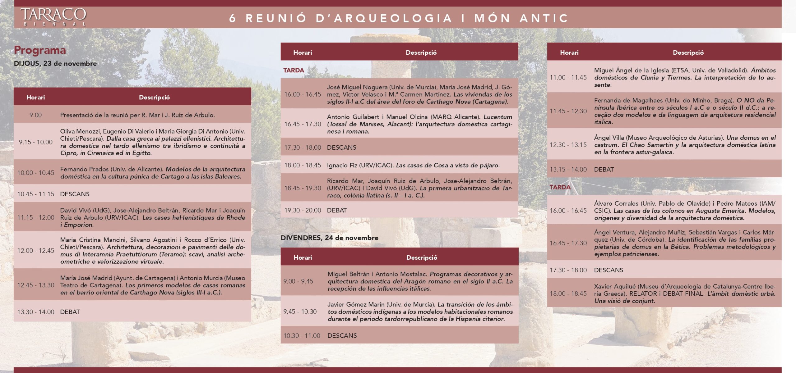 Entre les ponències del programa agafa protagonisme el cas específic de Tarraco, però també el d’Empúries, la vall de l’Ebre i el Maresme, i els casos d’altres grans ciutats d’Hispània, com Mèrida, Còrdova i Cartagena, així com les cases itàliques originals. Hi haurà una vintena de ponències que mostraran les últimes recerques en aquest camp, amb la participació d’investigadors d’Espanya, Itàlia i Portugal s d’Italia i Portugal i amb representació de totes les capitals provincials romanes de la península Ibèrica.