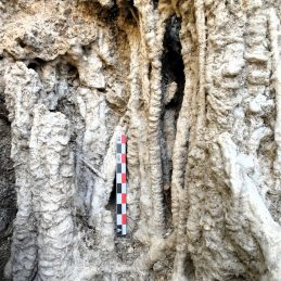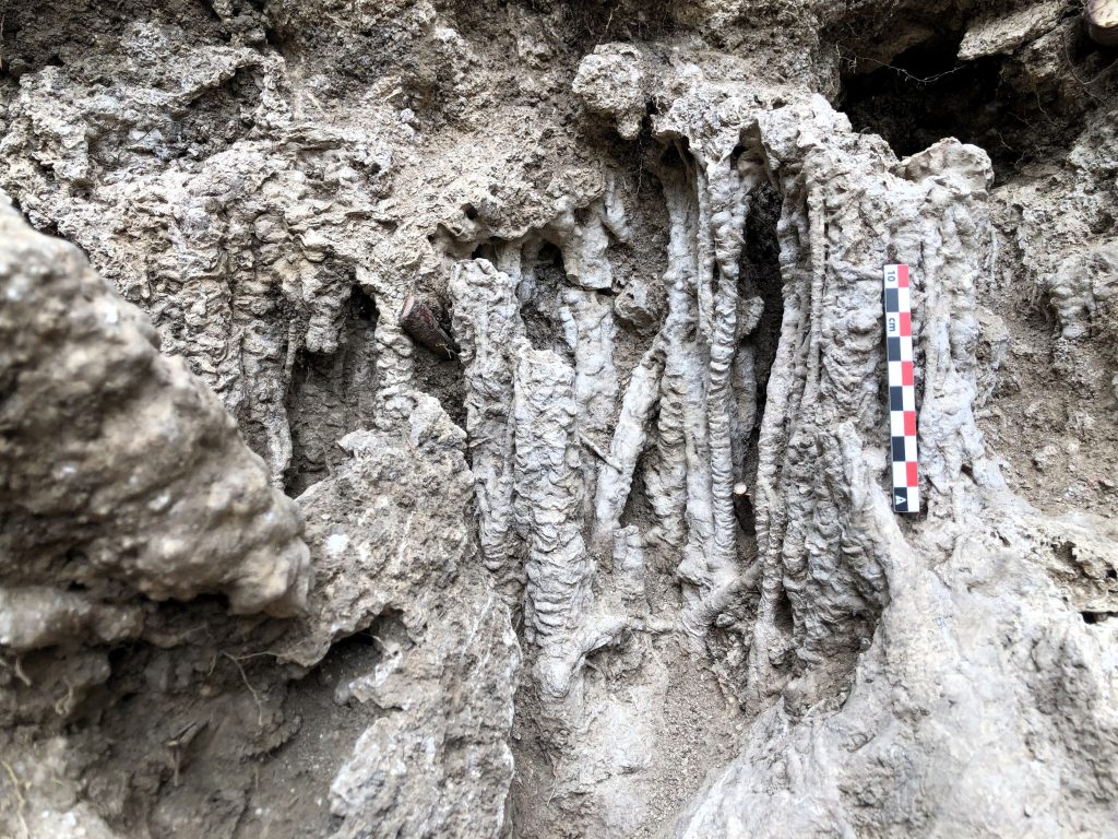 La sorpresa més destacada ha estat la identificació d’un petit pont de fusta. En un dels seus extrems s’ha localitzat el punt de connexió entre la séquia de fusta i l’aqüeducte d’obra. Aquest punt mostra el travertí fossilitzant la forma del calaix i una colada calcària amb estalactites i estalagmites formades per les antigues fuites d’aigua.