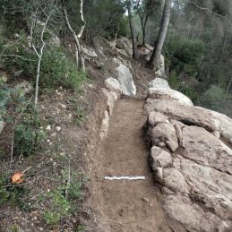 Un dels descobriments destacats és un marge de pedra seca situat a mig metre de fondària, alineat amb el pont romà. Aquesta troballa suggereix que els basaments del pont podrien trobar-se molt més profunds i que l’orografia en època romana era molt diferent de l’actual, amb un barranc que ara està completament reblert de sediments.