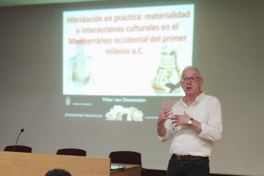 En la seva presentació, titulada Hibridización en práctica: materialidad e interacciones culturales en el Mediterraneo occidental del primer milenio a. C., Van Dommelen va fer èmfasi en la importància de posar en context i qüestionar els objectes que es troben a les excavacions arqueològiques. A més de tenir una funció i una identitat cultural, els objectes materials amaguen un seguit d’històries personals que ens parlen de les societats que els van crear i de les persones que els intercanviaven i usaven. La seva perspectiva d’anàlisi té molt en compte que aquests objectes poden haver estat sotmesos a processos de reinterpretació i revaloració per part de les noves societats en què s’introduïen.