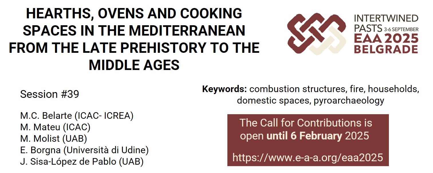 Dos membres de l’equip de Protohistòria del grup de recerca MIRMED, M. Carme Belarte i Marta Mateu, coorganitzen una sessió sobre estructures de combustió (llars i forns) com a elements clau en els espais domèstics de les societats del passat, juntament amb Miquel Molist (UAB), E. Borgna (Univ. de Udine) i J. Sisa-López de Pablo (UAB). Es tracta de la sessió 39: Llars, forns i espais de cuina a la Mediterrània des de la Prehistòria tardana fins a l’Edat Mitjana.