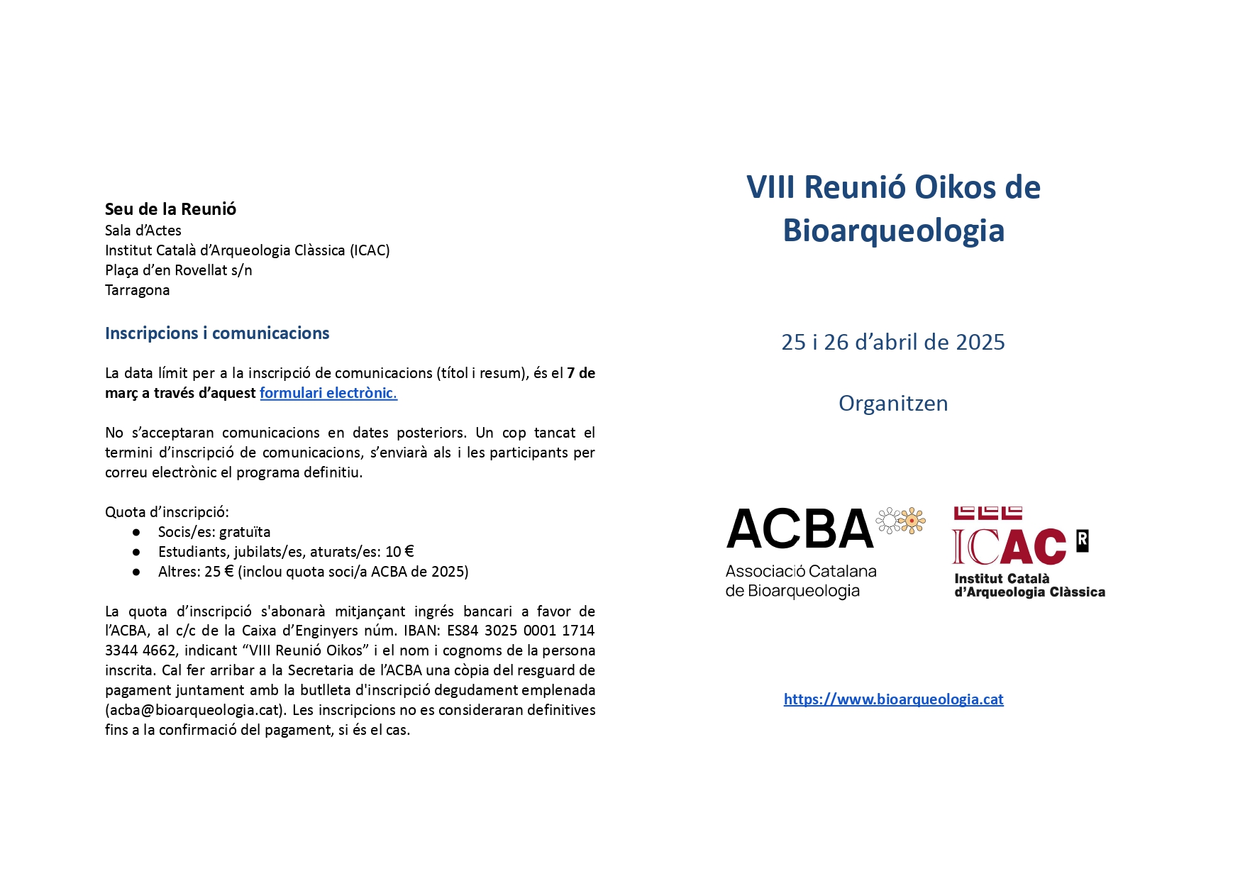 La data límit per a la inscripció de comunicacions (títol i resum) és el 7 de març de 2025.