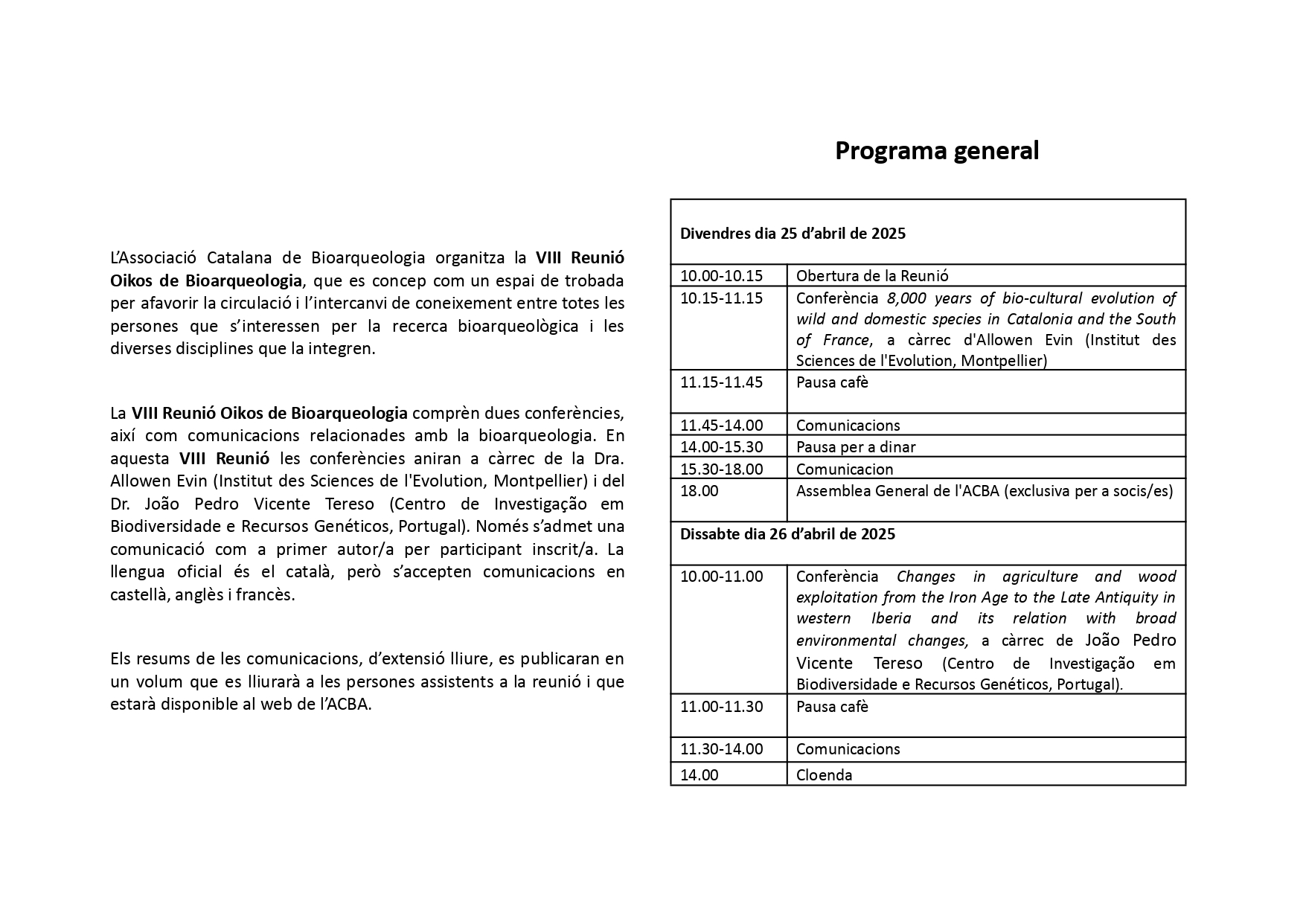 La VIII Reunió Oikos de Bioarqueologia comprèn dues conferències, així com comunicacions relacionades amb la bioarqueologia. En aquesta edició, les conferències aniran a càrrec de la Dra. Allowen Evin (Institut des Sciences de l’Evolution, Montpellier) i del Dr. João Pedro Vicente Tereso (Centro de Investigação em Biodiversidade e Recursos Genéticos, Portugal).