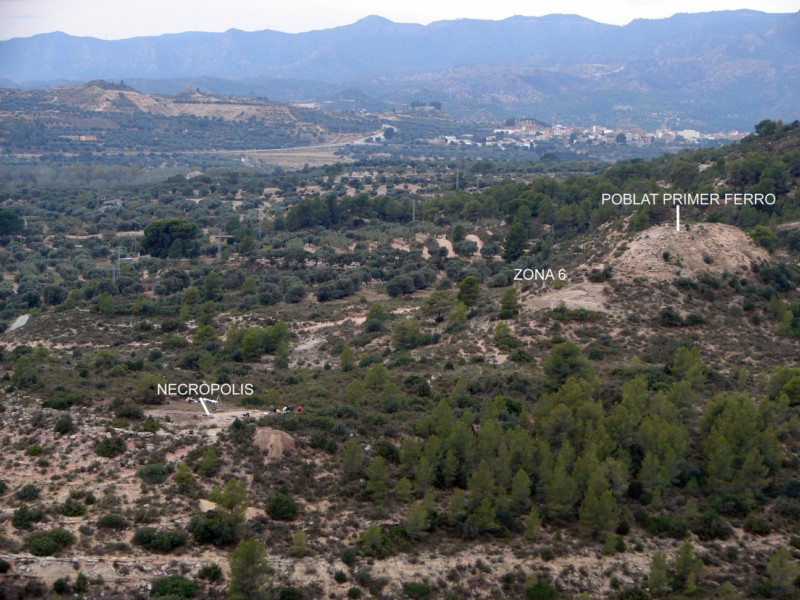 Fotografia aèria ampliada de la zona dels jaciments arqueològics. Durant la campanya del 2008 s’ha treballat al cementiri, format per túmuls sota els quals s’hi havien dipositat les urnes cineràries de ceràmica amb les restes de la cremació dels difunts, acompanyades d’objectes personals com braçalets de bronze. A més dels túmuls, les tombes pròpiament dites, hi ha altres estructures fetes amb pedra que s’interpreten com a elements rituals o commemoratius. Entremig dels túmuls també apareixen urnes de ceràmica que no contenien restes humanes i que, molt probablement, eren ofrenes. Fem una entrevista a
