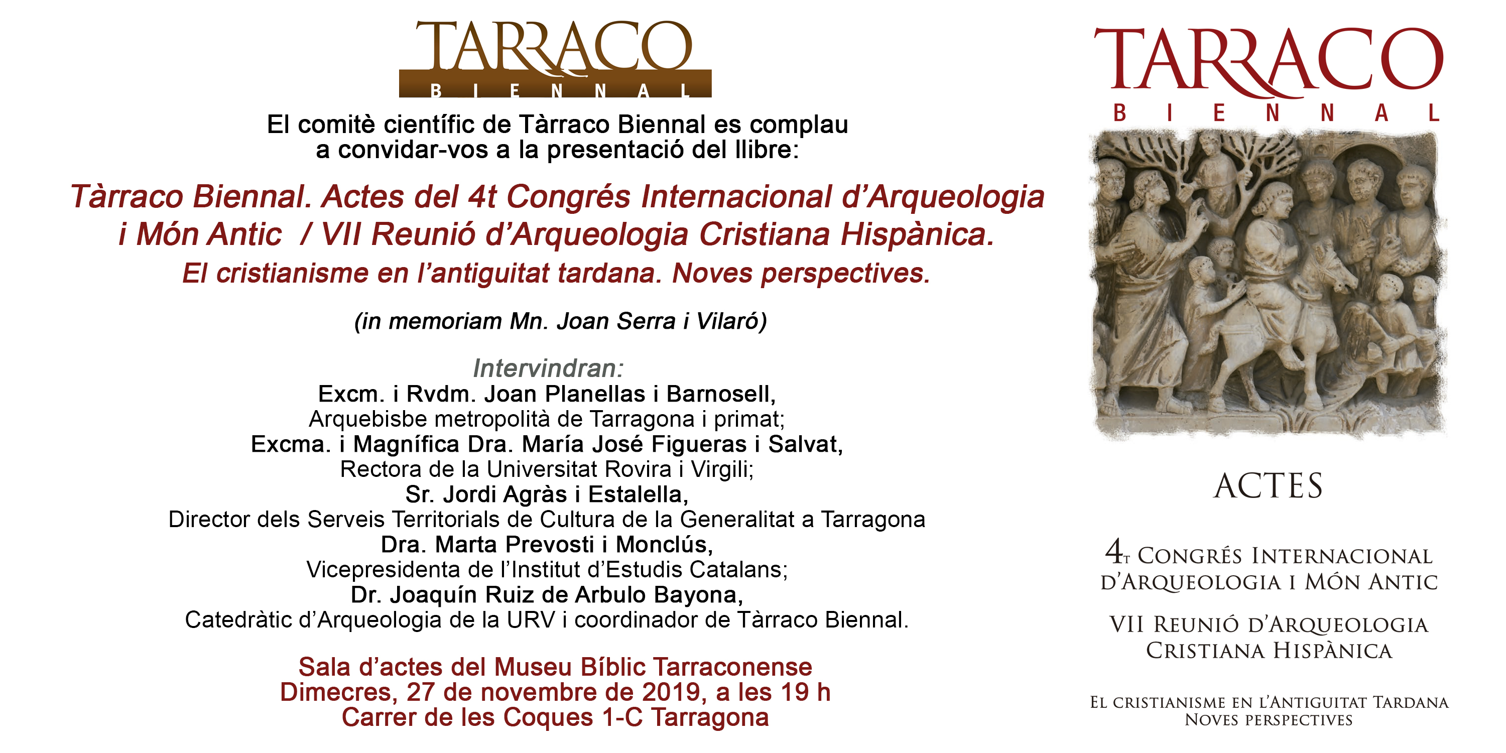 Presentació del llibre “Tarraco Biennal. Actes del 4t Congrés Internacional d’Arqueologia i Món Antic…” Data: 27/11/2019Hora: 19:00 hMuseu Bíblic Tarraconense (Sala d'actes)Tarragona (carrer de les Coques, 1 C)Organitza: Tarraco Biennal