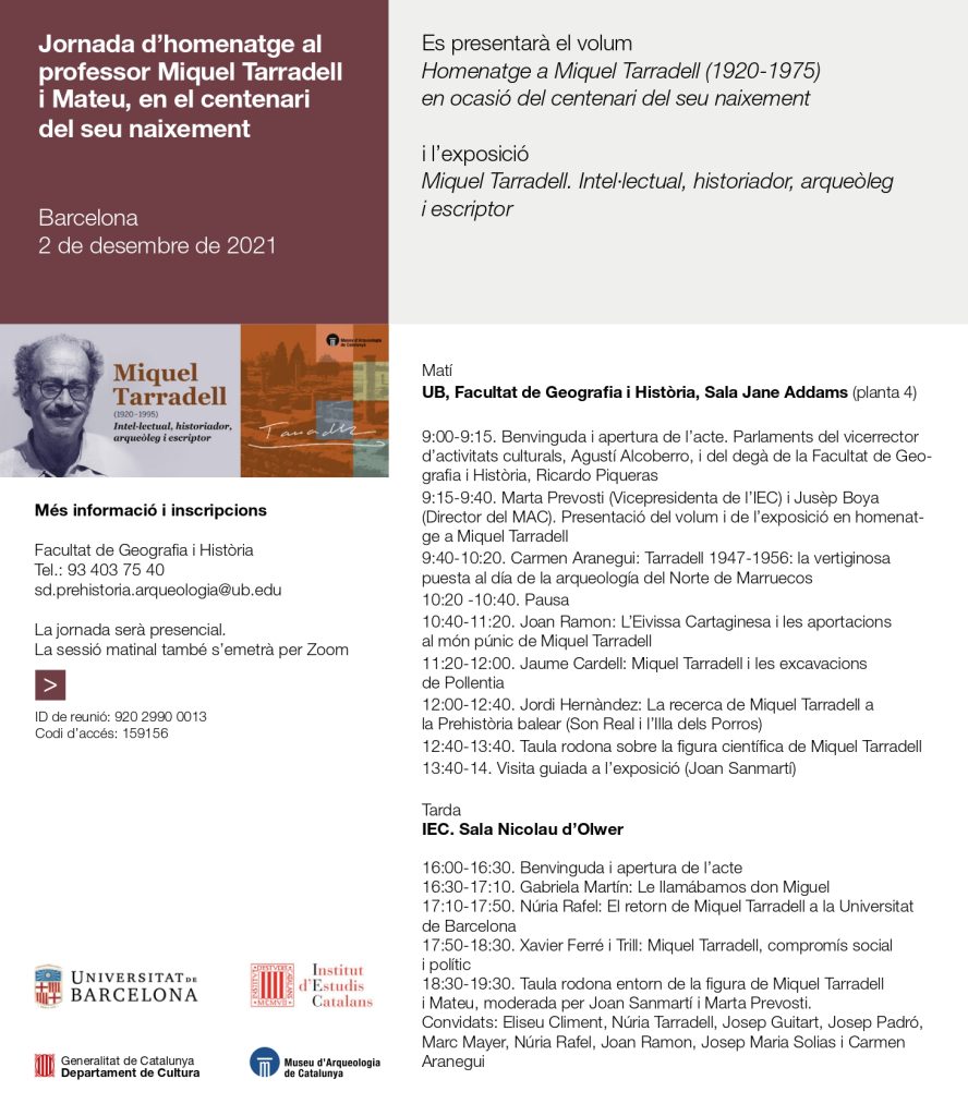 L’acte compta amb una sessió de matí a la UB (presencial i retransmesa per Zoom) i una sessió de tarda a l’IEC (presencial). En el mateix acte es presentarà el llibre Homenatge a Miquel Tarradell (1920-1995) en ocasió del centenari del seu naixement, a cura de Ferran Arasa, Marta Prevosti, Joan Sanmartí i Núria Tarradell-Font.