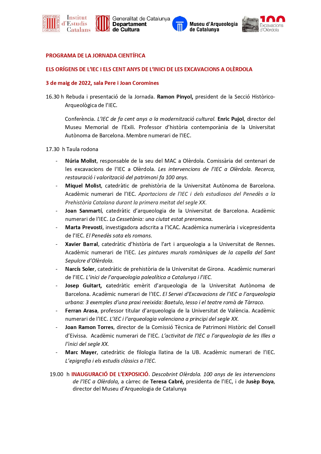 El dimarts 3 de maig es celebra a l’IEC (Barcelona) una jornada científica en motiu de la inauguració de l’exposició Descobrint Olèrdola. 100 anys de les intervencions de l’IEC a Olèrdola.