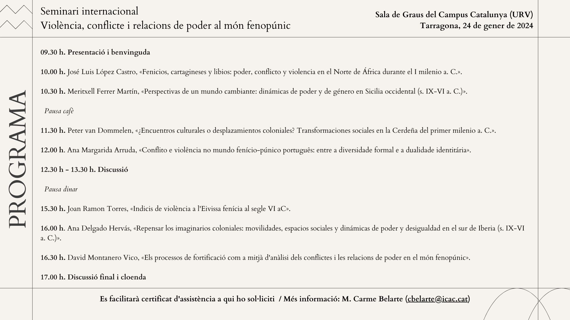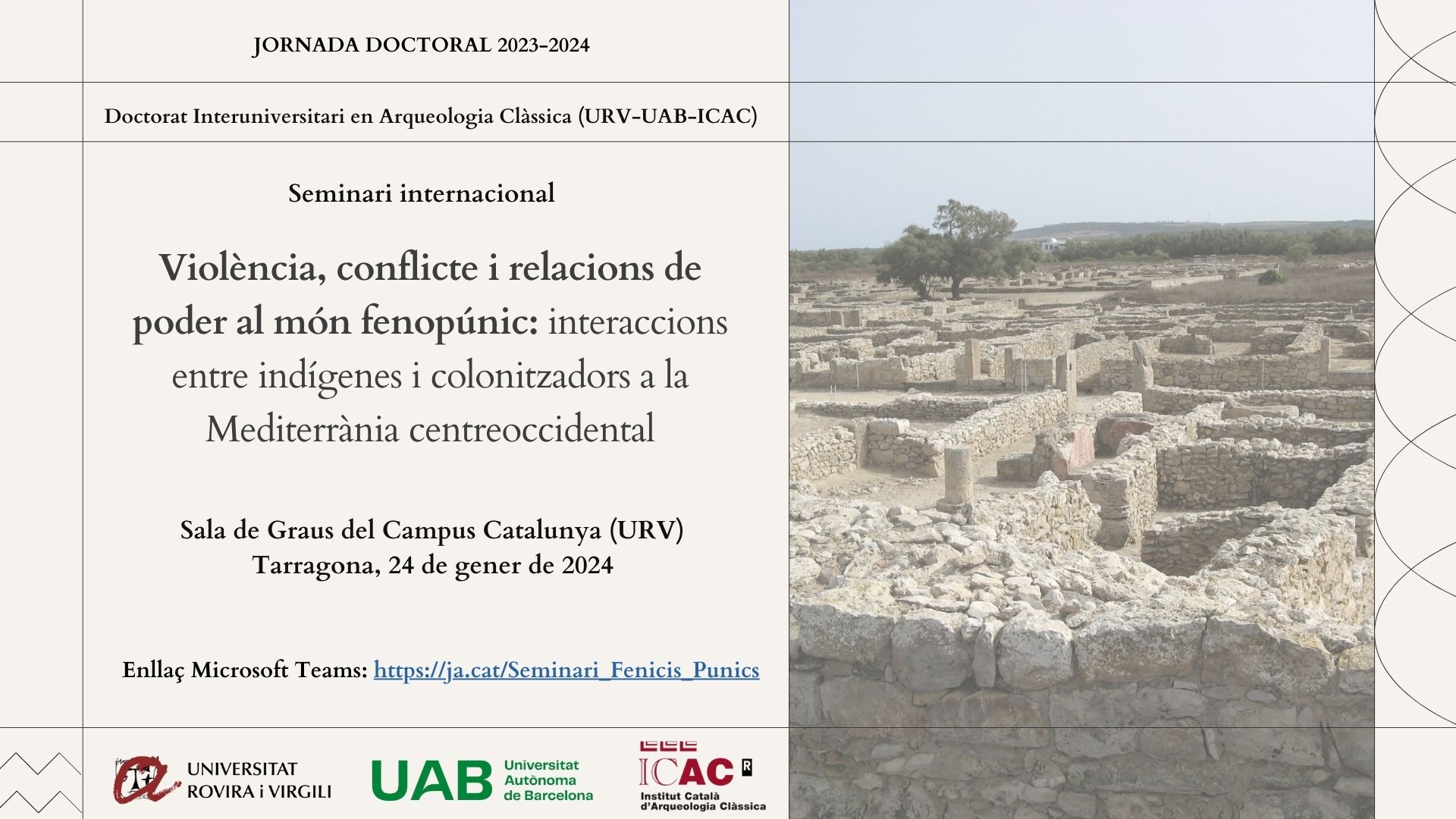 En el marc del programa de Doctorat interuniversitari en Arqueologia Clàssica (URV-ICAC-UAB), us convidem al Seminari internacional «Violència, conflicte i relacions de poder al món fenopúnic: interaccions entre indígenes i colonitzadors a la Mediterrània centreoccidental».