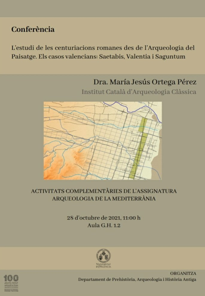 Aquest dijous, 28 d’octubre, a les 11 h, la investigadora adscrita a l’equip GIAP Xusa Ortega impartirà la conferència “L’estudi de les centuriacions romanes des de l’arqueologia del paisatge. Els casos valencians: Saetabis, Valentia i Saguntum“, a la Facultat de Geografia i Història de la Universitat de València.