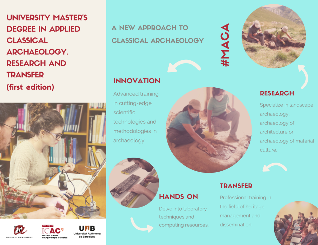 The University Rovira i Virgili (URV), the Catalan Institute of Classical Archaeology (ICAC) and the Autonomous University of Barcelona (UAB) collaborate in the organisation of the University Master’s Degree in Applied Classical Archaeology. Research and Transfer (MACA) for advanced training in the application of cutting-edge scientific techniques and technologies to archaeology.