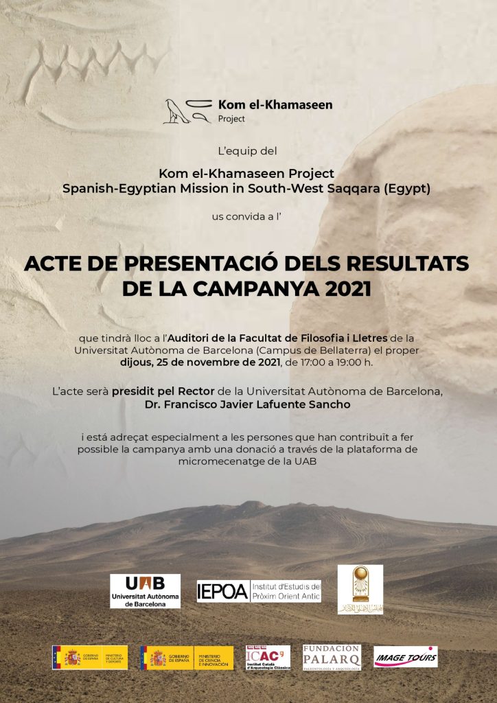 L’equip del projecte Kom el-Khamaseen us convida a l’acte de presentació dels resultats de la campanya 2021 a Saqqara (Egipte), en què ha participat Josep Maria Puche de l’ICAC.