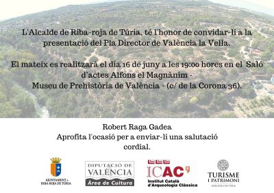 Presentació del Pla Director de València la Vella Author(s): Ávila, T.; Macias, J. M.; Marco, A.; Ribera, A.Dates: 16/06/2022 - 16/06/2022
