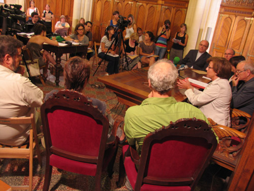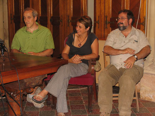 Imatge de la roda de premsa el 7 de juliol i dels tres directors de les excavacions (d’esquerra a dreta, Josep M. Macias, Andreu Muñoz i Imma Teixell).