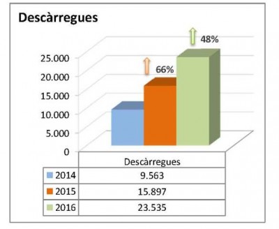 Destaca l’augment de les descàrregues dels articles consultats, que és del 42%. Actualment es descarrega un de cada tres articles consultats.