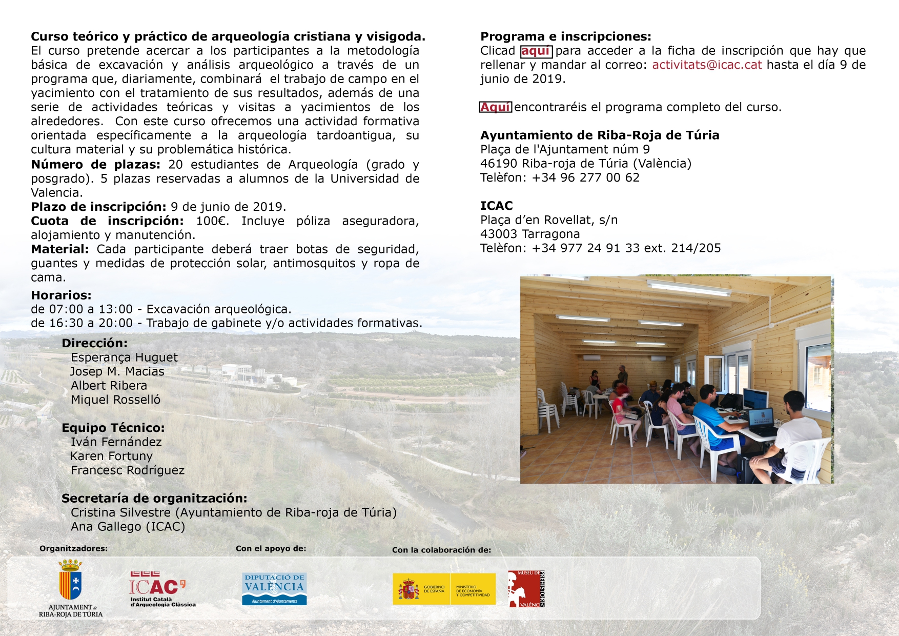 Se ha ampliado el periodo de inscripción al IV Curso práctico de arqueología cristiana y visigoda, que organizan el ICAC y el Ayuntamiento de Riba-roja de Túria y que tendrá lugar del 29 de julio al 16 de agosto de 2019 en el yacimiento de Valencia «la Vella».