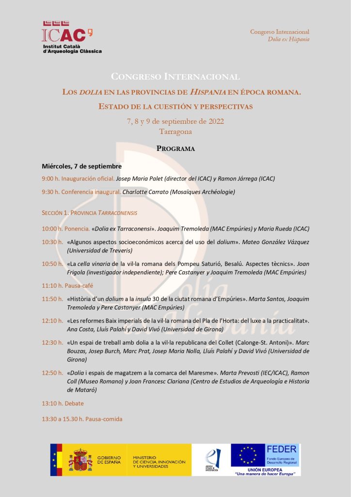 De las 10 h y hasta las 18 h se sucederán trece comunicaciones, correspondientes a la sección de la provincia Tarraconensis y que empezarán con una ponencia de Joaquim Tremoleda (MAC Empúries) y Maria Rueda (ICAC) titulada «Dolia ex Tarraconensi».