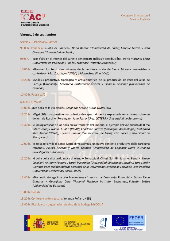 El viernes 9 de septiembre será el turno de la provincia Betica que, con cuatro comunicaciones, dará comienzo a las 9 h con la ponencia «Dolia ex Baetica», a cargo de Dario Bernal (Universidad de Cádiz), Enrique García e Iván González (Universidad de Sevilla), y Oriane Bourgeon (ICAC).
