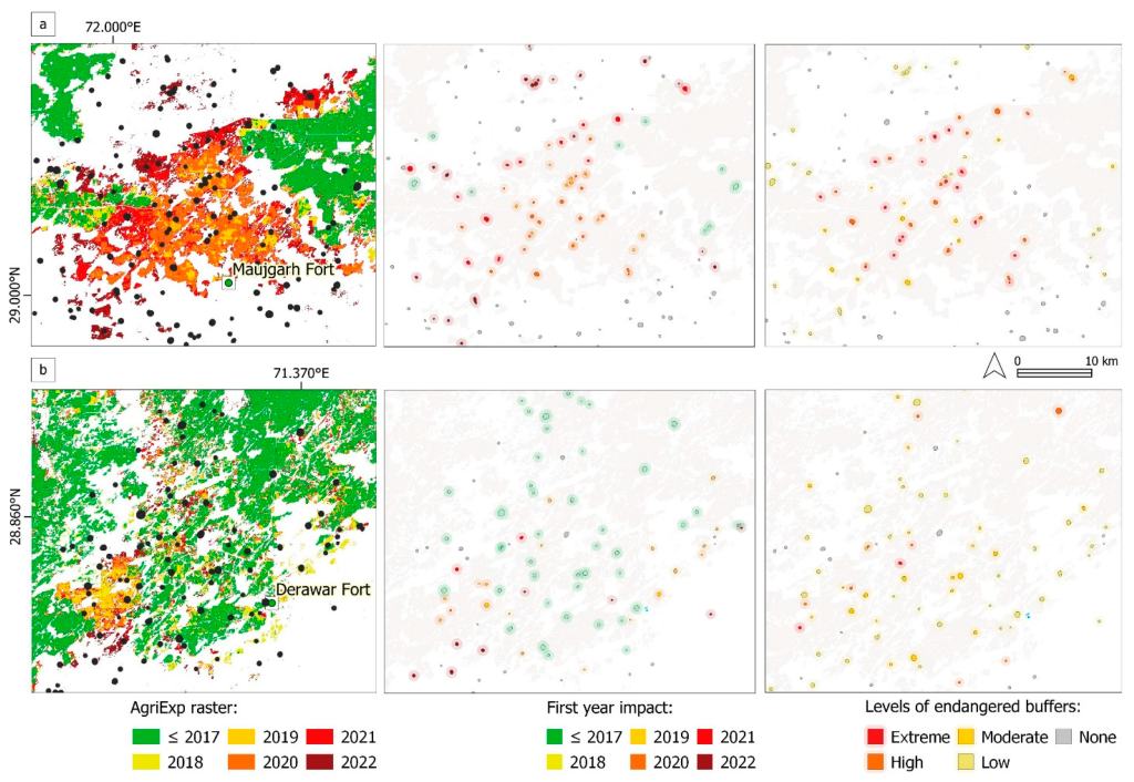 De acuerdo con el estudio, la aplicación de AgriExp muestra una transformación generalizada de los pastizales del desierto a partir de 2018. En 2020, decenas de túmulos fueron invadidos y parcialmente nivelados, y en la actualidad al menos el 50 % de los hallazgos conocidos de la región presentan algún grado de afectación por recientes desarrollos de regadío.