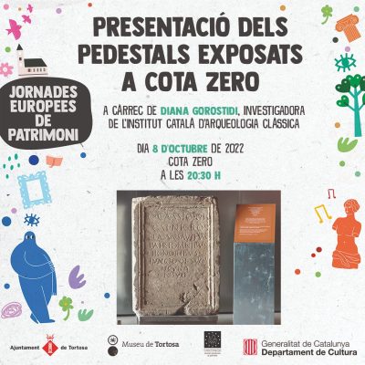 Presentació dels pedestals exposats a COTA ZERO Autor/es: Gorostidi, D.; Feliu, H.; Buey, T.Fecha: 08/10/2022Jornades Europees de PatrimoniTortosaOrganiza: Museu de Tortosa, Generalitat de Catalunya, Ajuntament de Tortosa